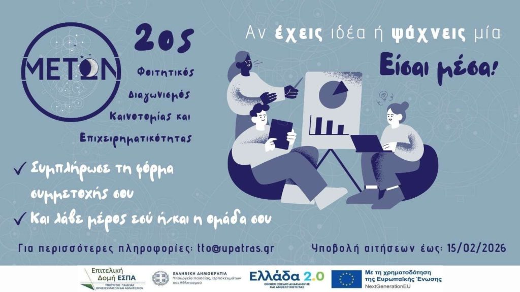 Το Πανεπιστήμιο Πατρών διοργανώνει για δεύτερη φορά τον Φοιτητικό Διαγωνισμό Καινοτομίας και Επιχειρηματικότητας «ΜΕΤΩΝ» με στόχο την ανάδειξη καινοτόμων ιδεών των φοιτητών του.